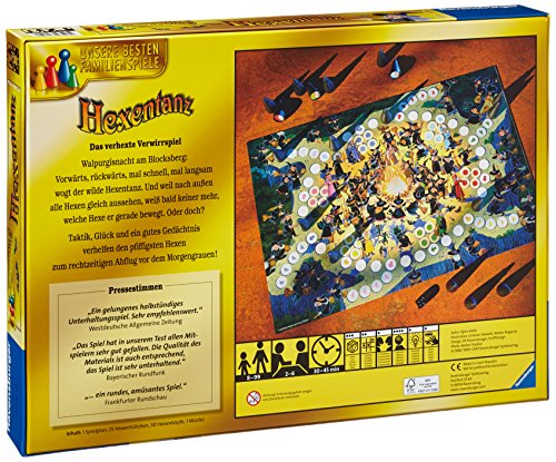 Walpurgisnacht am Blocksberg: Vorwärts, rückwärts, mal schnell, mal langsam wogt der wilde Hexentanz. Und weil nach außen alle Hexen gleich aussehen, weiß bald keiner mehr, welche Hexe er gerade bewegt. Oder doch? Taktik, Glück und ein gutes Gedächtnis verhelfen den pfiffigsten Hexen zum rechtzeitigen Abflug vor dem Morgengrauen!