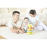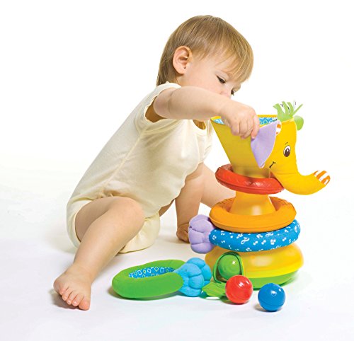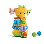Lustiger Elefant als Ballrutsche – mit Musikfunktion, geeignet von 6-18 Monate. Dieses Spielzeug wandelt sich mit dem Alter ihres Kindes und bietet in jedem Entwicklungsstadium eine neue Herrausforderung! 6-9 Monate: Das Baby kann zunächst im Liegen mit den rasselnden und klingenden Bällen spielen, sie erkunden und mit ihnen aneinander klatschen. 9-12 Monate: Nachdem ihr Kleines sitzen gelernt hat, kann es den Ball durch die Öffnung am Kopf in die Ballrutsche befördern und dabei zusehen, wie der Ball mit lustiger Musikunterstützung unten wieder herauskommt! 12-18 Monate: Jetzt kann die Motorik schon stärker gefordert werden! Nehmen sie den Kopf des Elefanten ab und lassen sie ihr Kind es versuchen, den Ball durch das dünnere Rohr in die Rutsche zu lassen. So wird die Feinmotorik und die Zielgenauigkeit ihres Kindes optimal gefördert! Zusätzlich zur Ballrutsche, kann der Elefant immer wieder neu und bunt zusammengesetzt werden. Über dem Rutschrohr befinden sich weiche Ringe, die immer neu angeordnet werden können!
